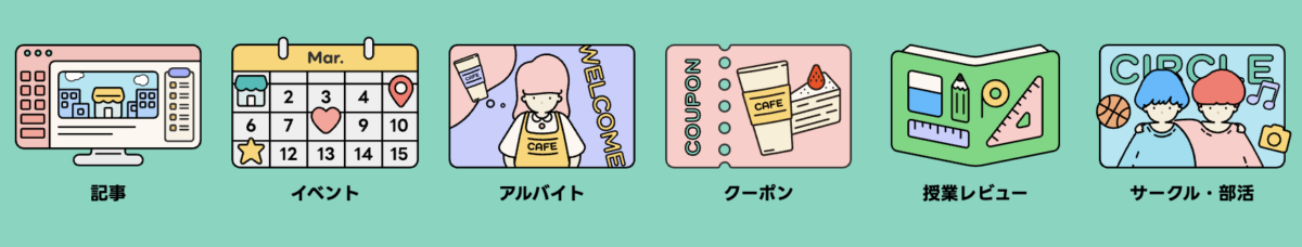 クーポン | 飲食店や美容室、温泉、雑貨屋さんなど、学生向けの割引が使えます。「学生証提示で〇%オフ」などお得情報が一覧で見られるので、外食や買い物前にチェックすると節約になります。 |