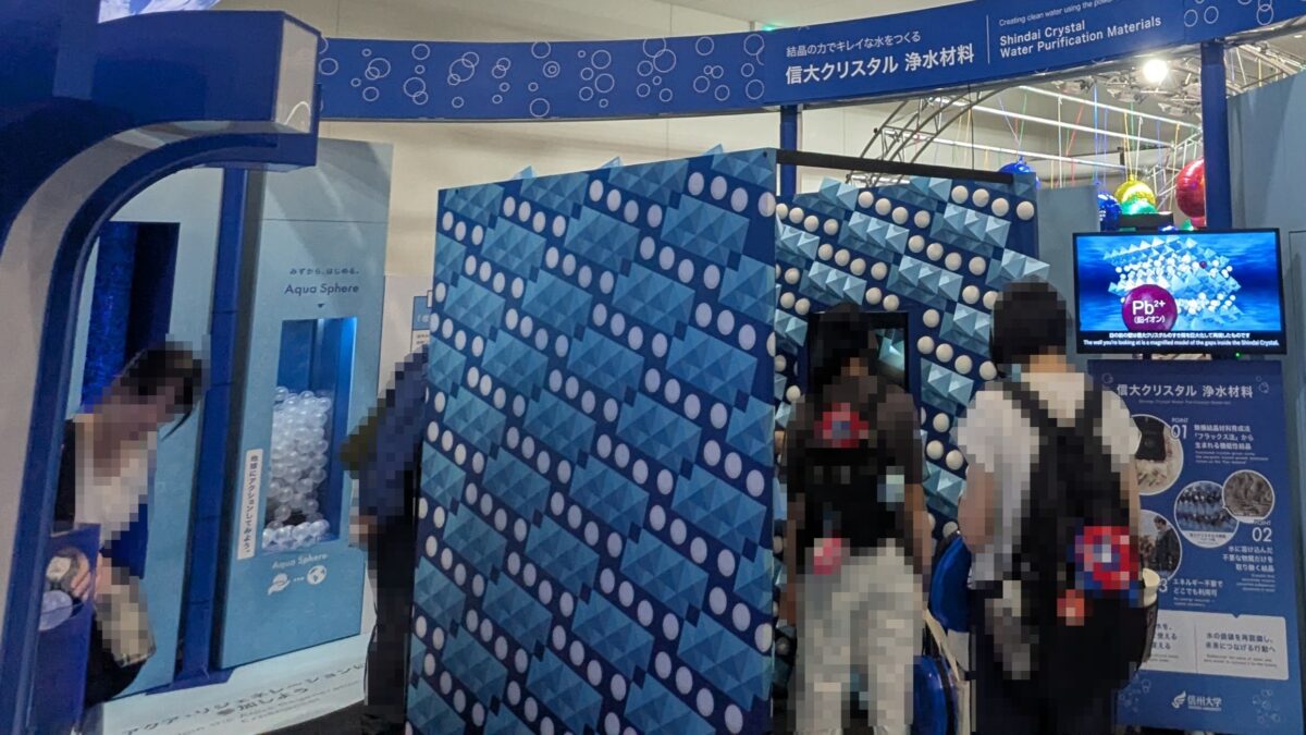 会場では信大クリスタルを模した壁の間を通ることができました。自分が水になった気持ちになって、まさに浄化される体験ができました。この技術は、後述する浄水設備「swee」にも生かされています!