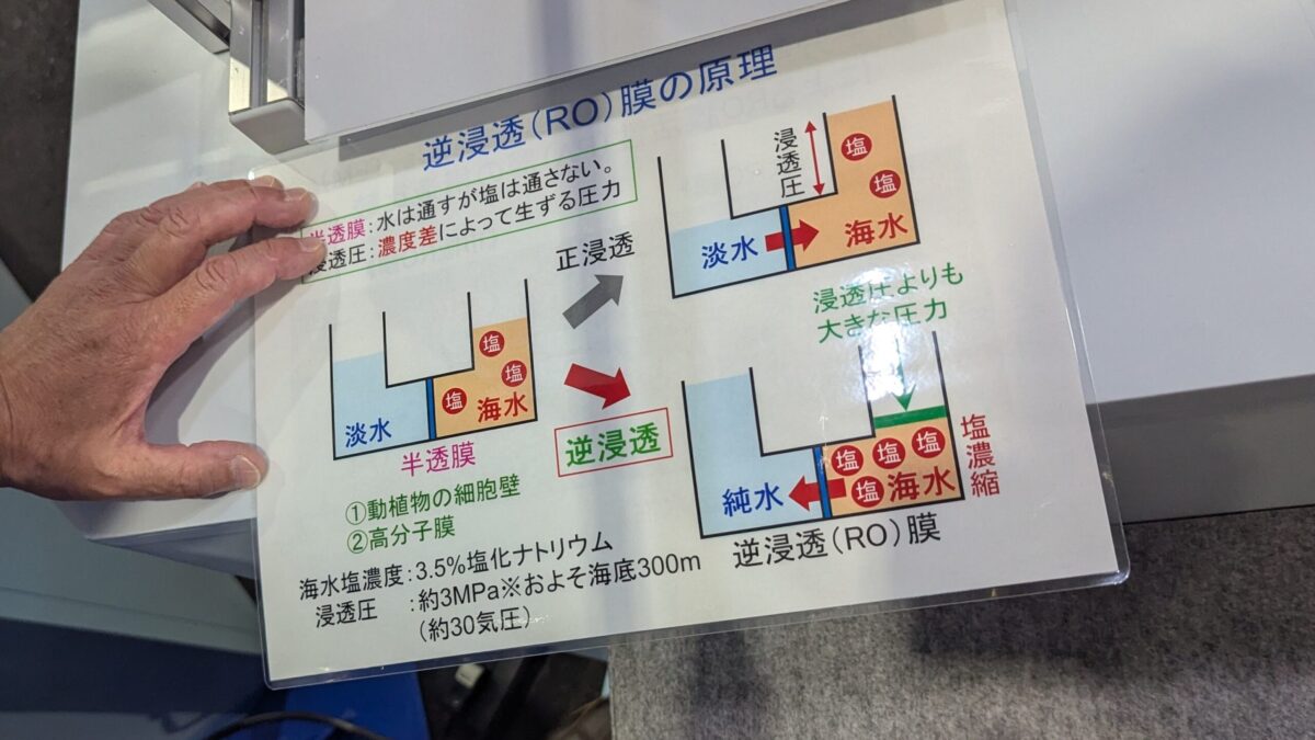 逆浸透膜とは、数ナノメートルレベルの小さなすきまをもつ膜。海水を、圧力をかけながら逆浸透膜に通すことで、海水に含まれる塩分などの膜のすきまよりも大きな物質が取り除かれ、真水を作ることができます。