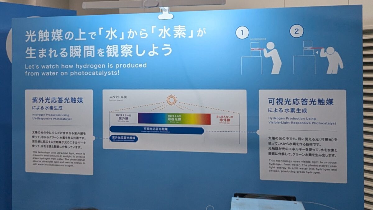 光触媒を用いて、CO2を排出せず水素が生成できるそうです!会場では、実際に水から水素と酸素の混合気体が発生する様子が観察できました!