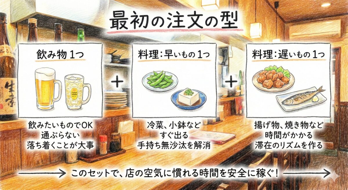 席に着いた瞬間に緊張が上がって、「何を頼めば正解なんだろう」と頭が真っ白になる人は少なくありません。ここで大事なのは、正解探しをやめて、最初の動きを“型”にしてしまうことです。
