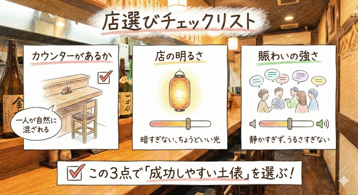 - 店選びで8割決まるので、カウンターのある店を軸に「明るさ」「賑わい」を見て土俵を選びます。