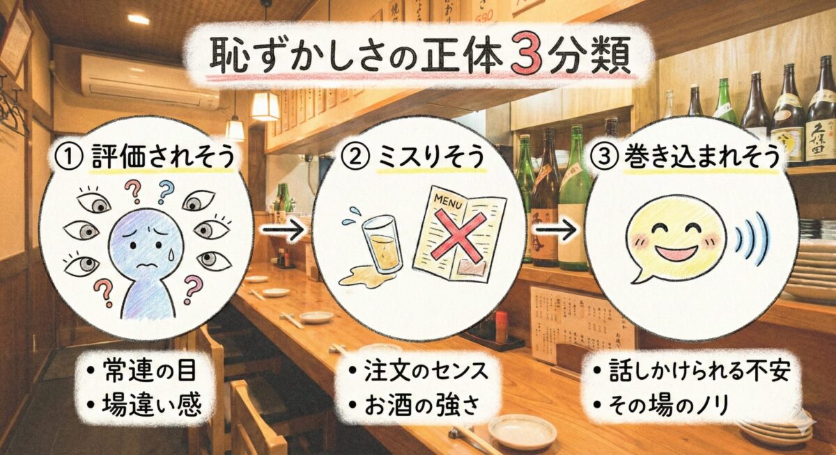 一人飲みは、気合で慣れるというより「仕組みで勝つ」ほうがラクです。恥ずかしさや緊張は消そうとするより、先に手当てできる形に分解しておくと動きやすくなります。
