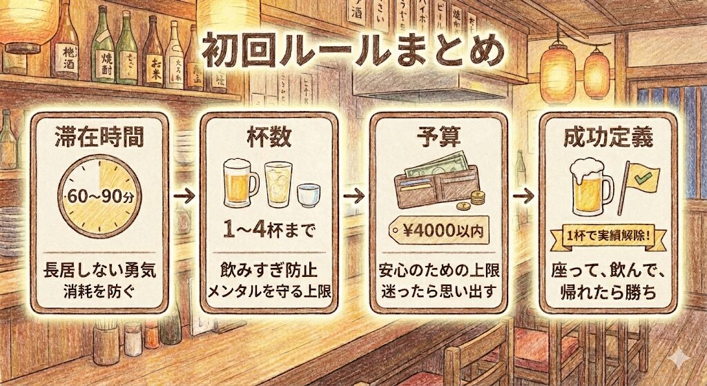 最後に、初回の成功確率をさらに上げるために、滞在時間や杯数、予算を数字で区切って“撤退の安心”まで作ります。