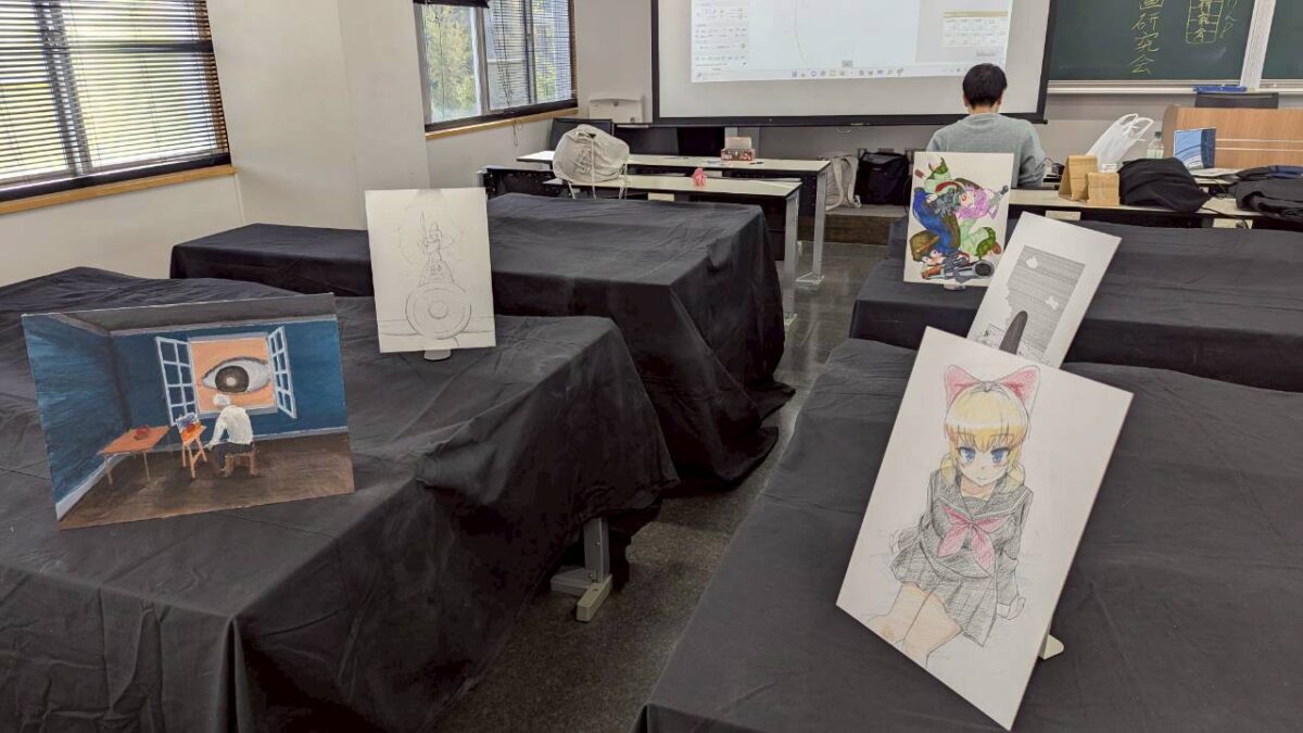部員が描いたイラストやオリジナル漫画が飾られていました! さらにスクリーンでライブドローイングも行っていました。部員オススメの漫画作品もたくさん並べられていました。
