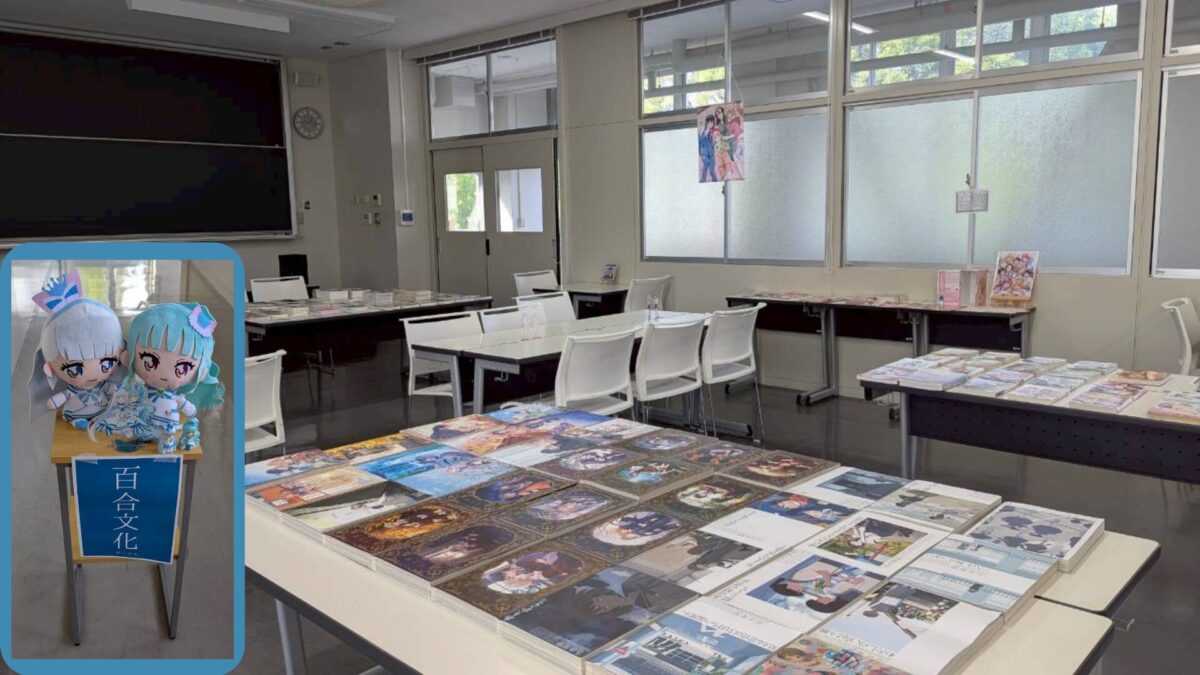 百合とは、ざっくりいえば女性どうしの恋愛のこと。百合ジャンルの漫画やイラストが数多く飾られていました。部誌も販売しているそうです。