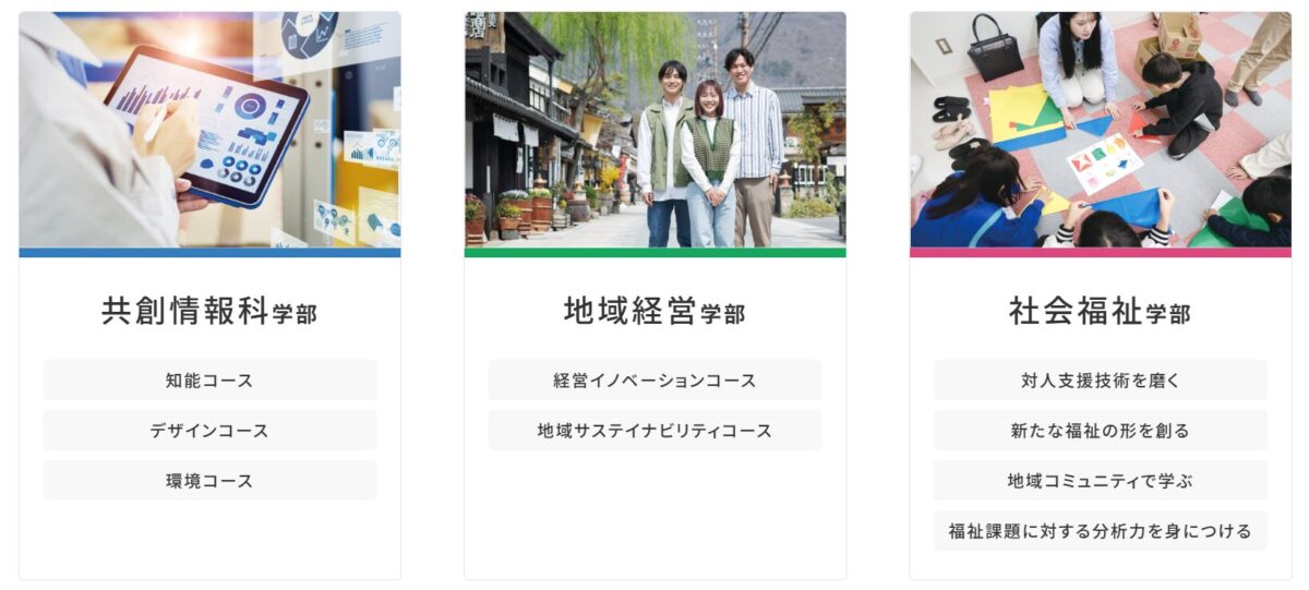現在では社会福祉学部、企業情報学部、環境ツーリズム学部の3学部があります。2026年4月入学から環境ツーリズム学部と企業情報学部の統合した地域経営学部と共創情報科学部、社会福祉学部になります。今年受験生の人は特にHPをよく確認しておきましょう!