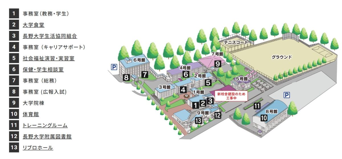長野大学ってどんなキャンパスなんだろう?そんな疑問を持つ高校生や、名前は知っているけれど詳しくは知らない大学生のみなさんに向けて、長大のキャンパスを紹介します。いま長野大学は、新しい学部や新棟建設と、どんどん進化中。この記事では、長大生が普段よく使っている建物や、学生生活の中心になる場所をピックアップしてご紹介します。これを読めば、長大生が役立つ施設がわかるはずです!