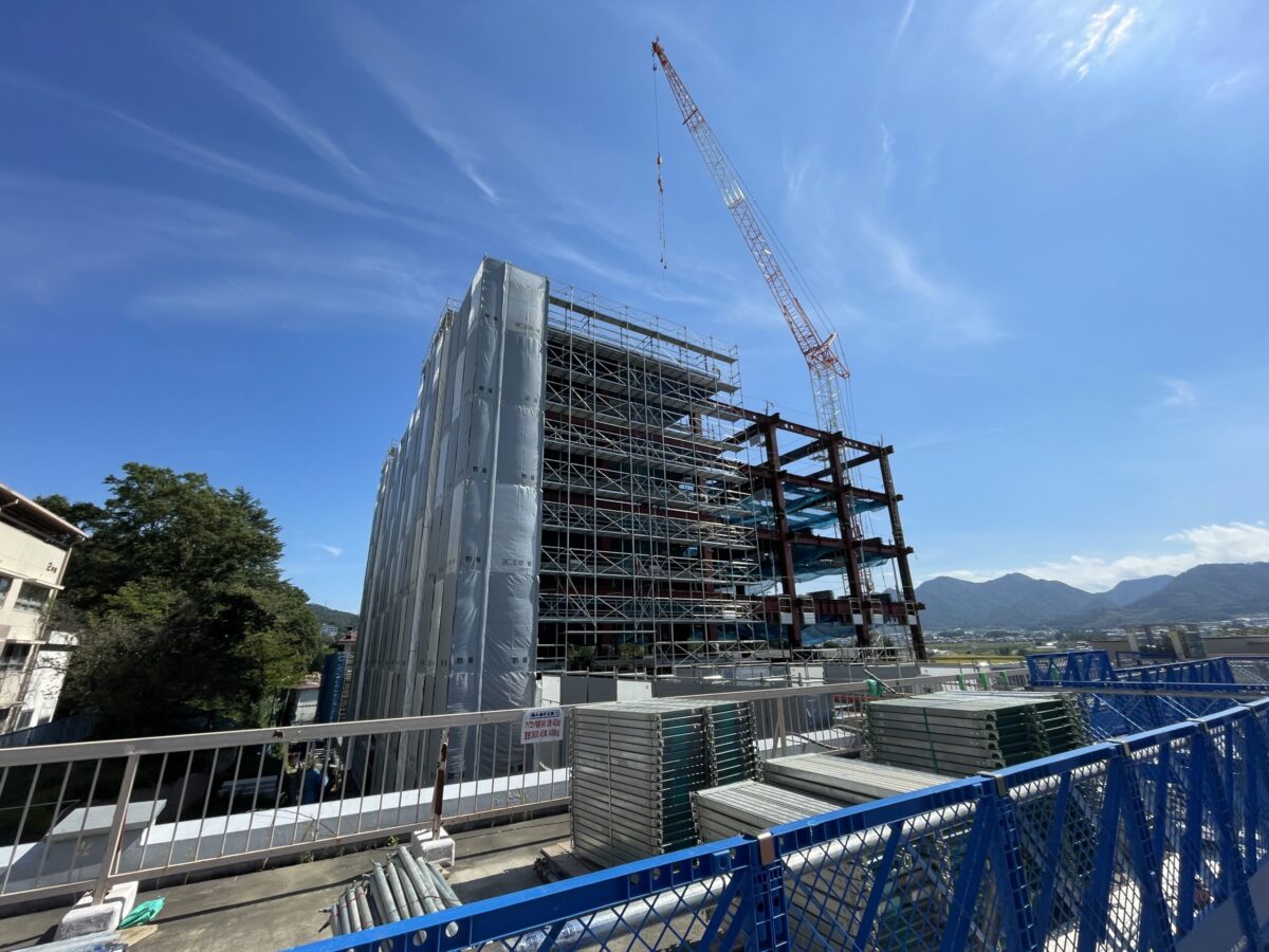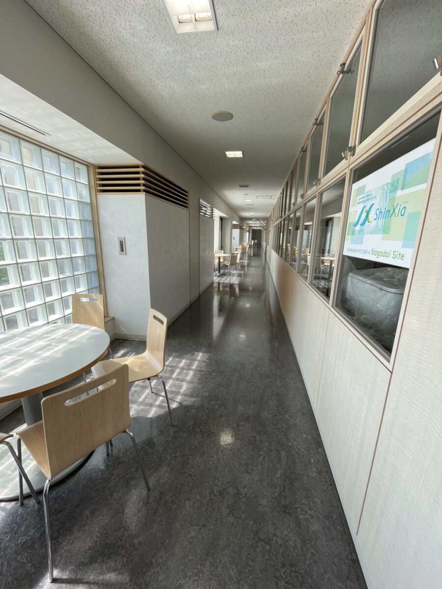 そして、「共創情報科学部」及び「地域経営学部」の開設に向けて、長野大学としての中核研究拠点となる新棟を建設しています。研究室だけでなく、全学生が利用できる学生食堂やラウンジも1,2階に整備されるそうです。