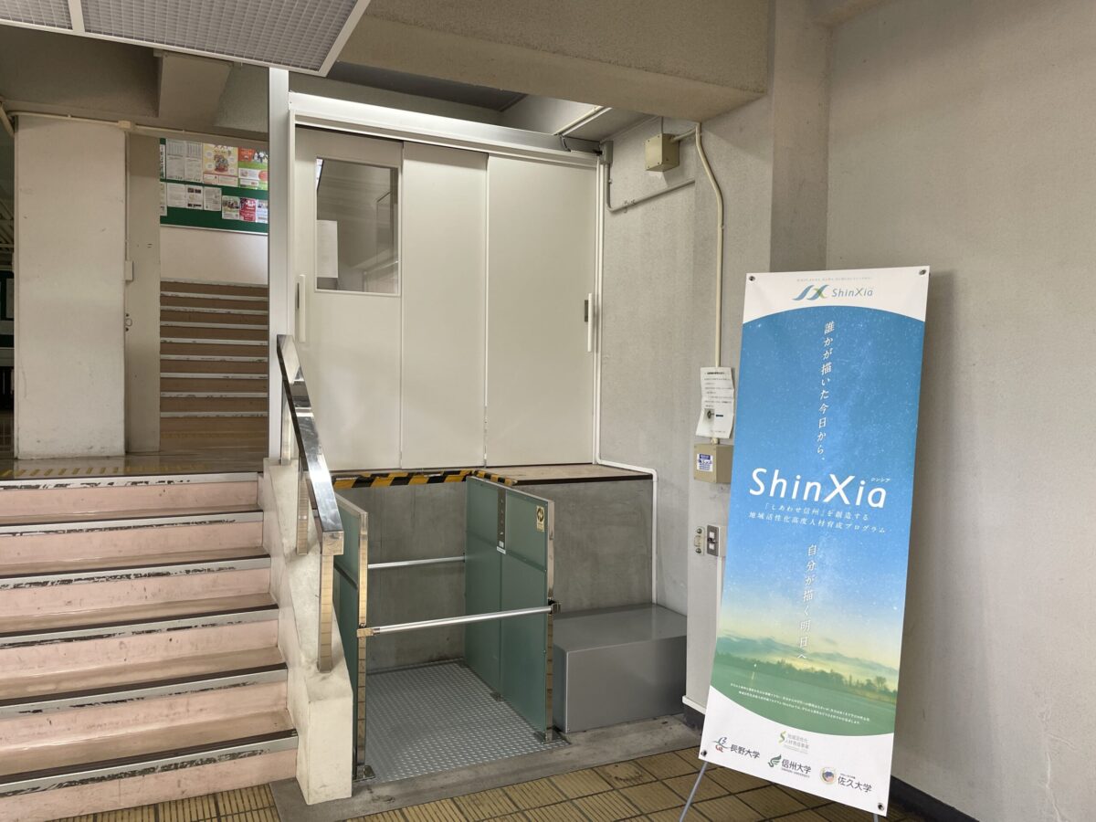 正面玄関を入って左手に車いす用階段昇降機がありました。長野大学では至る所にバリアフリーのデザインがなされていました。社会福祉学部らしさを感じますね。