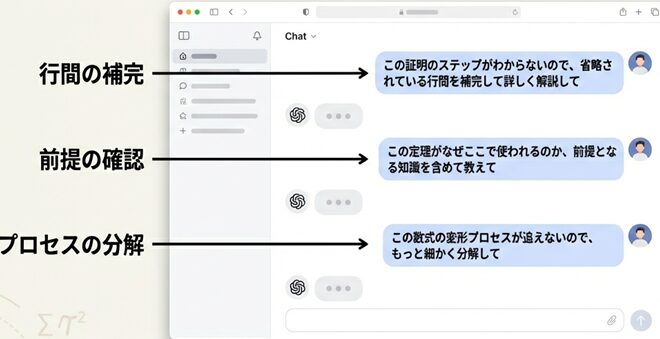 - 「この証明のステップがわからないので、省略されている行間を補完して詳しく解説して」