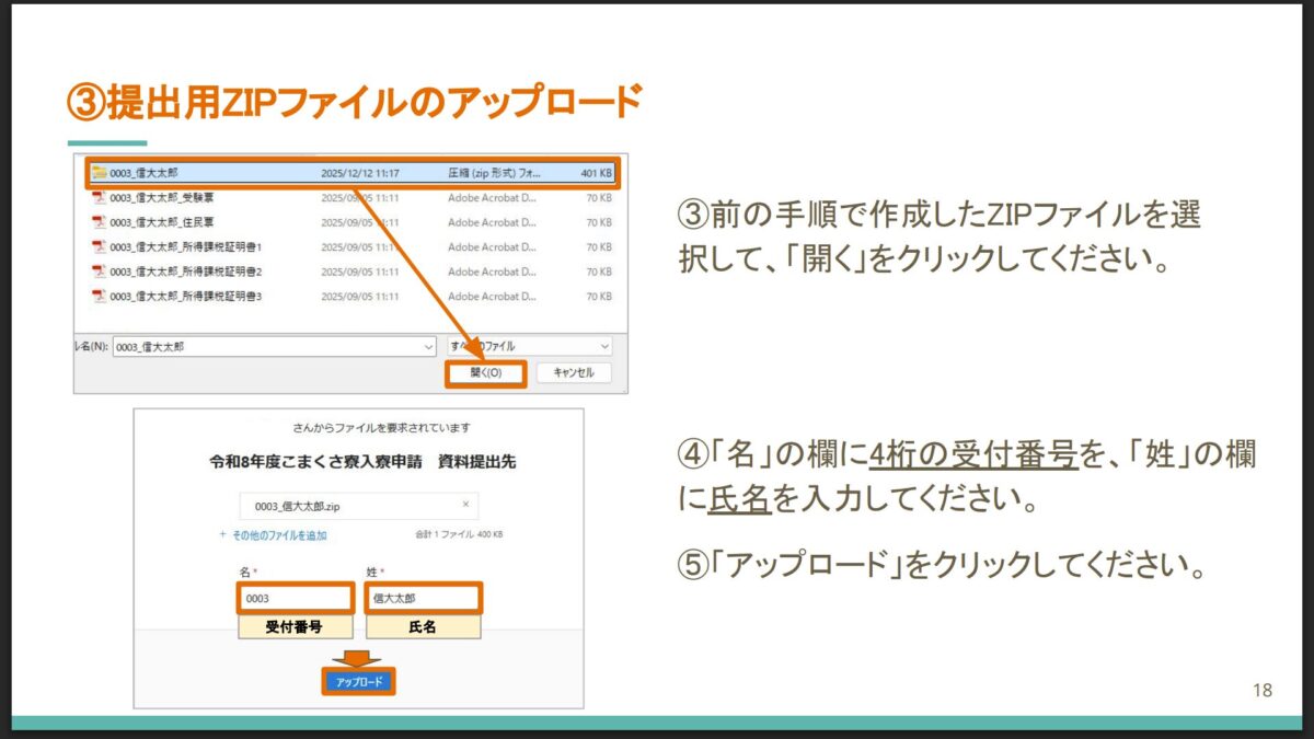 メールで受付番号とともに送られてきたリンクからzipファイルをアップロード。