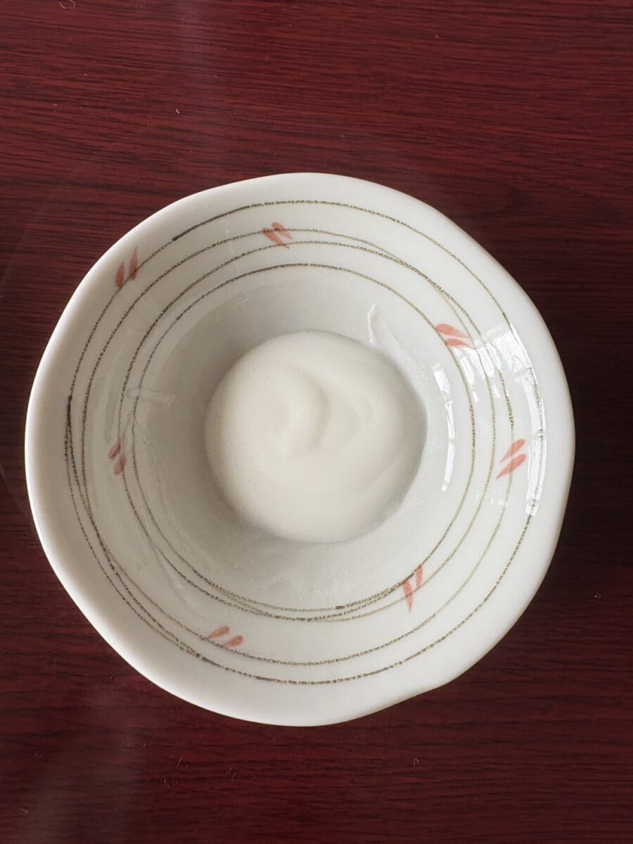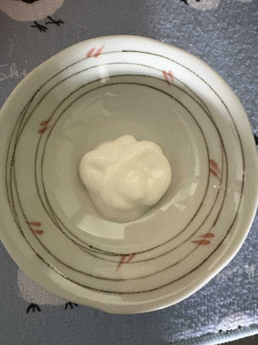 ヨーグルトの固さを比較するため、お皿に出してみました。写真がうまく撮れずわかりにくくてすみません。左が①1回も揉んでいない状態、右が②50回くらい揉んだ状態です。